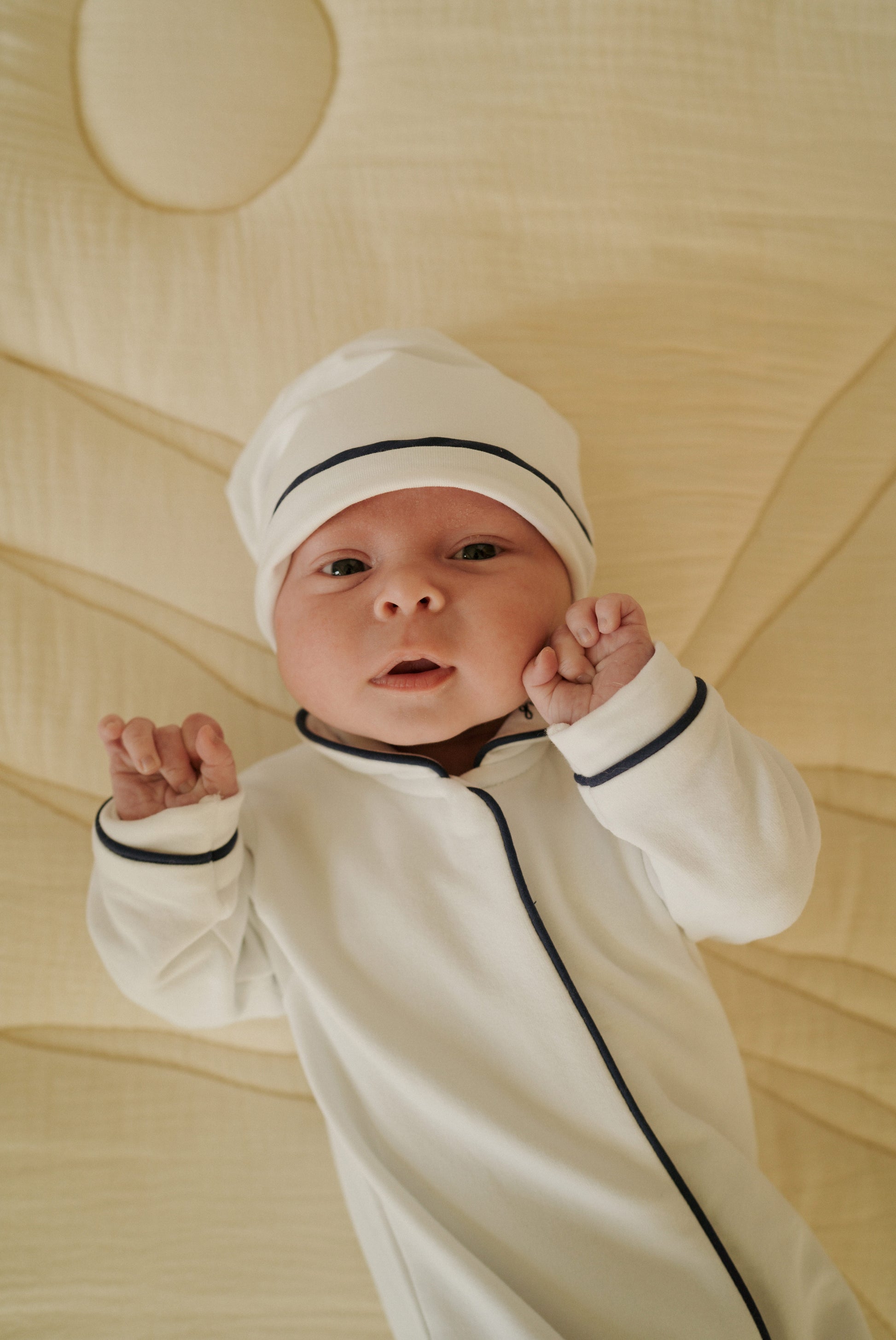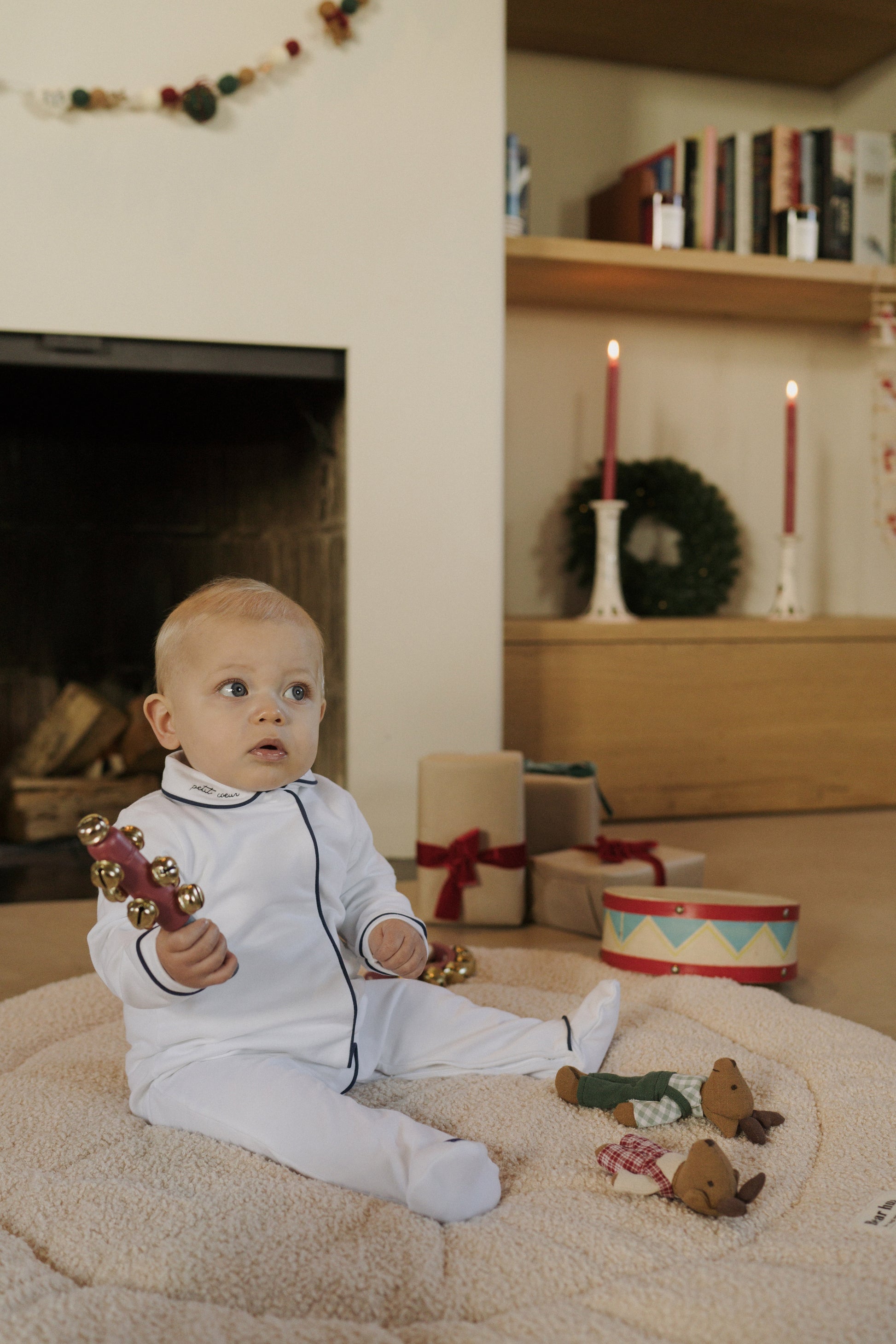 Guide your little one through the night where every dream is a magical journey. Our « Rêve Magique » baby pyjamas are a serene symphony of pure white and calming blue accents. Delicate details grace the collar with 'petit coeur' on one side and 'grand rêveur' on the other. Finished with invisible press studs in front.